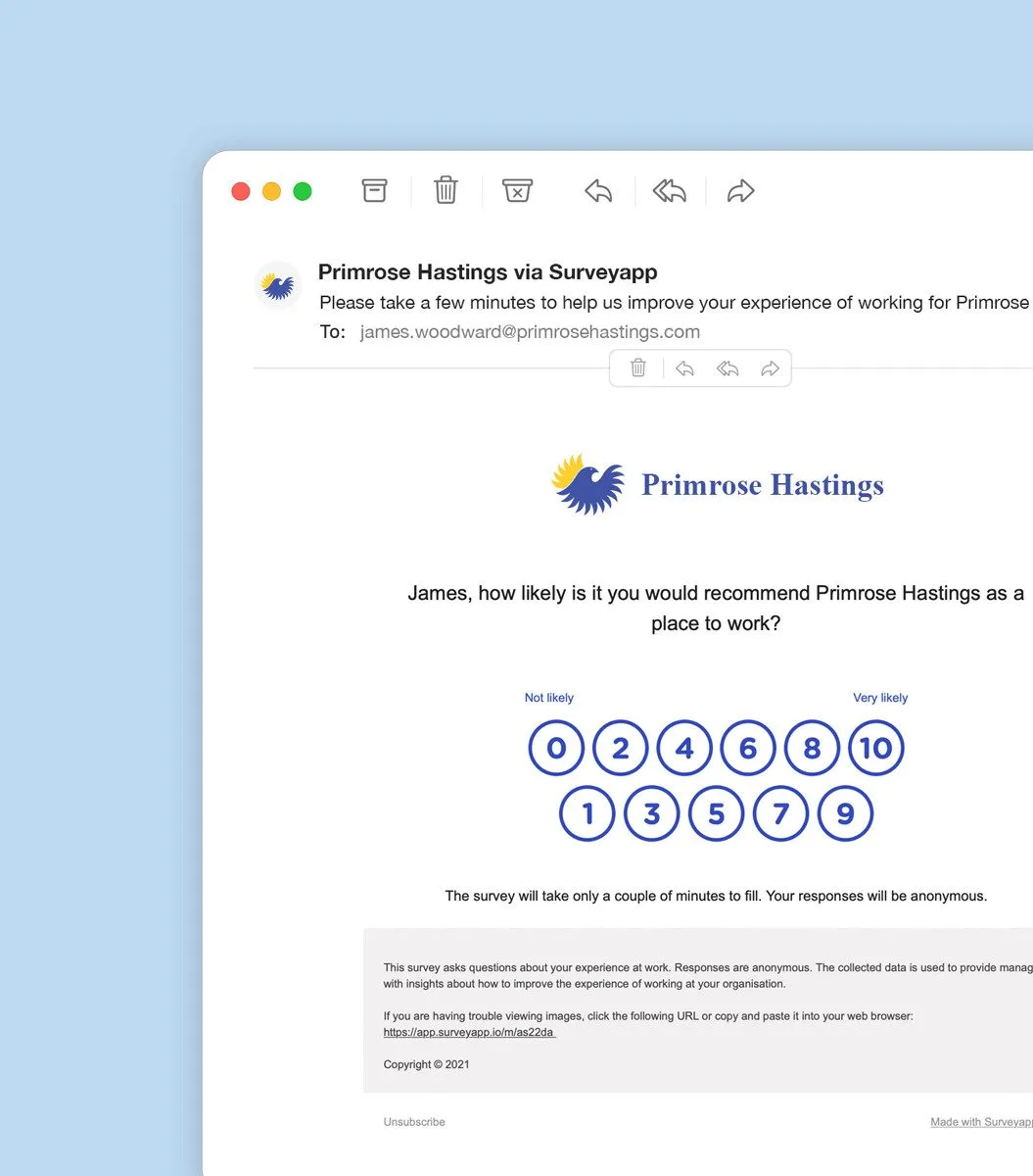 end out timely customised email surveys to find out how your customers and employees feel. Track any experience metric including NPS, eNPS, CSAT or Customer Effort Score.