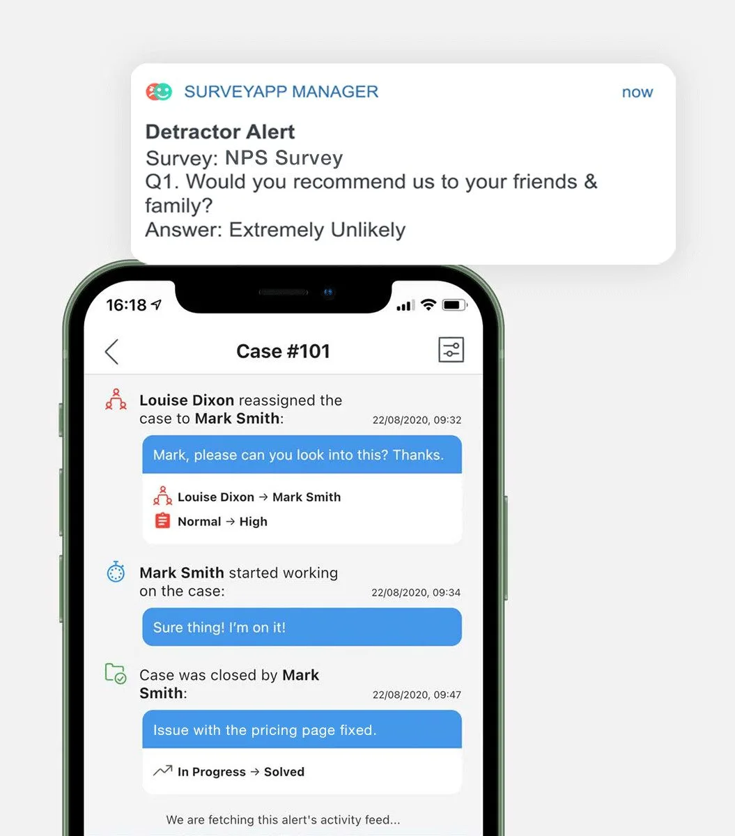 When service levels drop, Surveyapp’s case management software makes sure alerts are sent to the right team member for the job. By acting quickly, you can turn around customer satisfaction, retain loyalty, and grow spend.