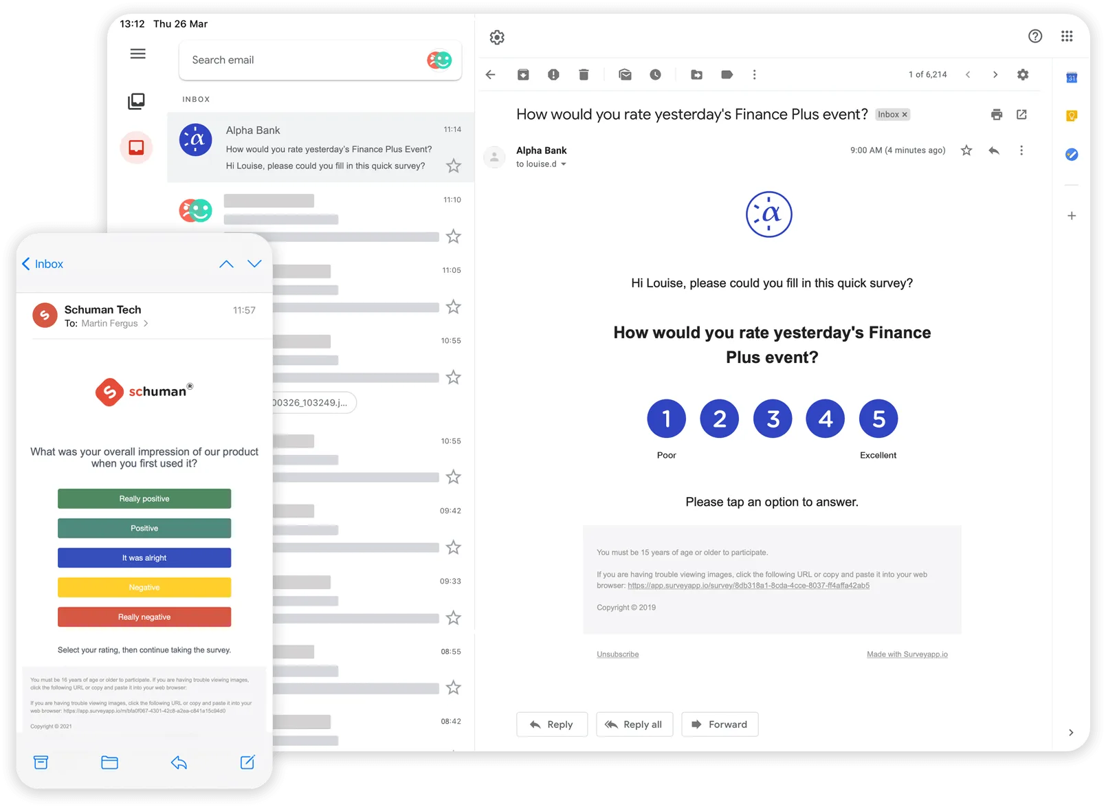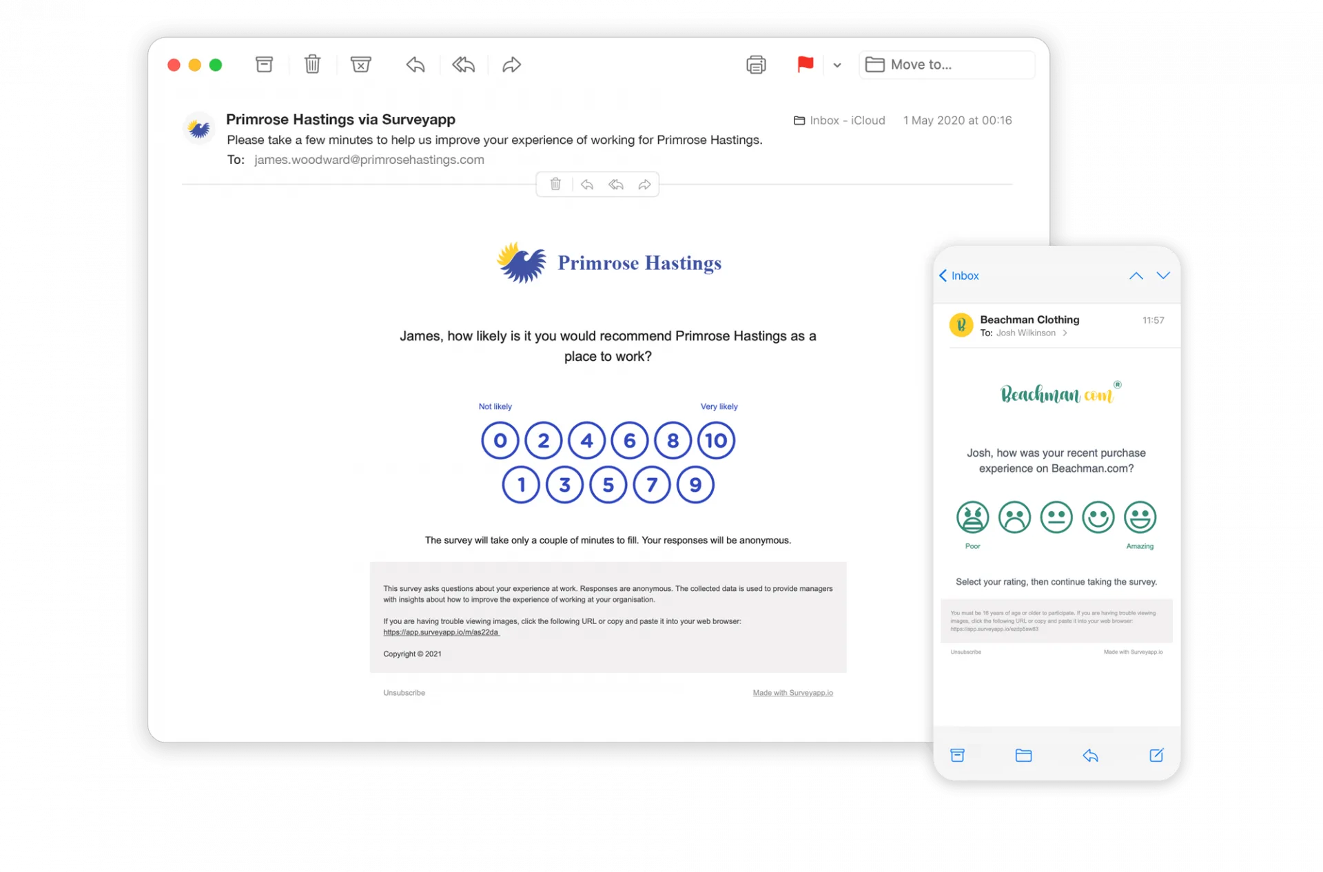 Whether your customers and employees are using a mobile, tablet or computer, Surveyapp email surveys are designed to look gorgeous and function perfectly every time in every email client, email app and web browser.
