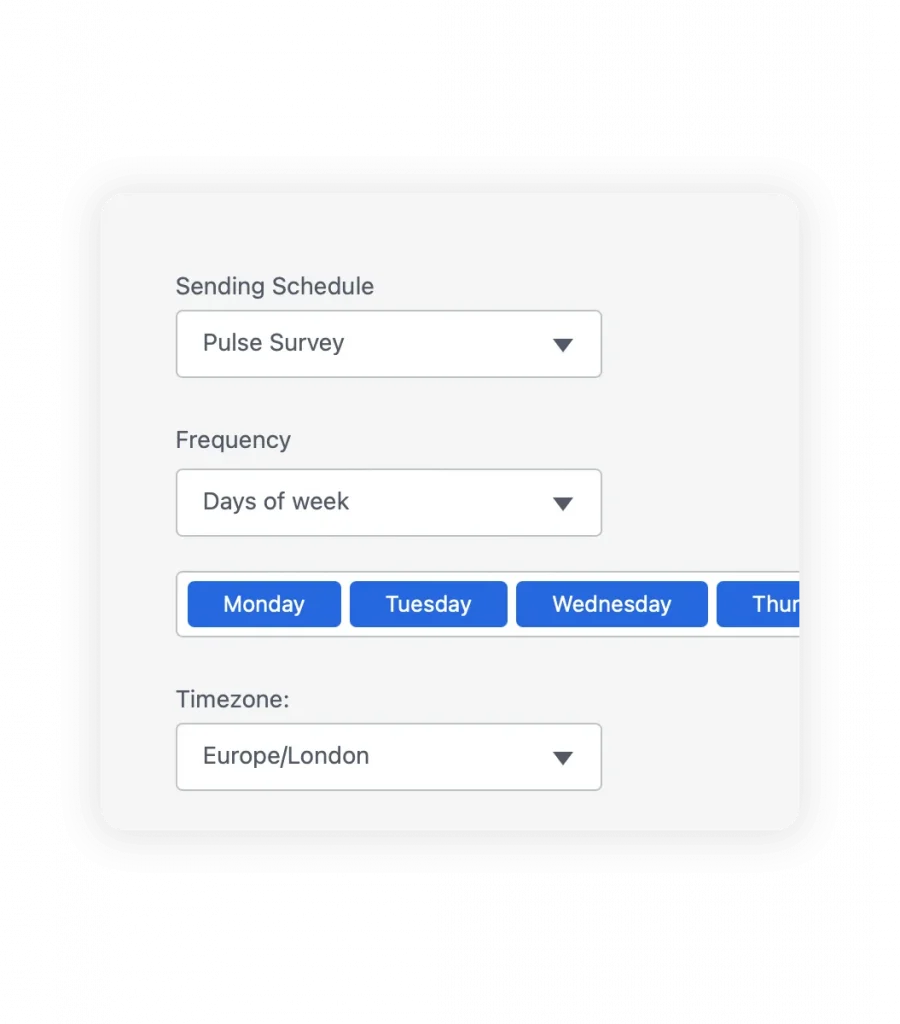 Use Pulse Surveys to move towards real-time employee feedback. Short and strategic, pulse surveys let you connect with front-line employees to quickly measure and improve performance during critical periods. You can run multiple survey schedules, frequencies, and questions across your organisation.
