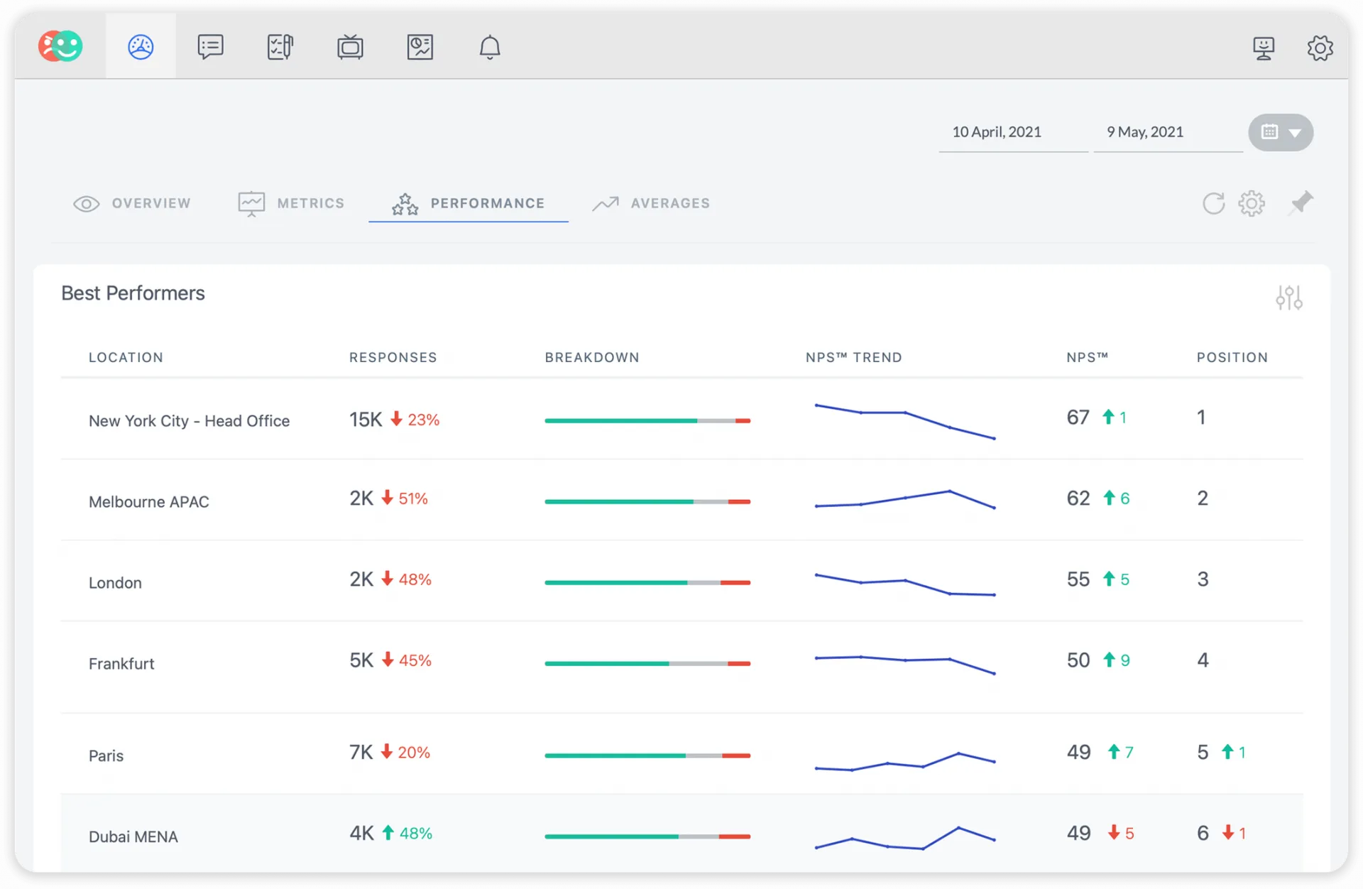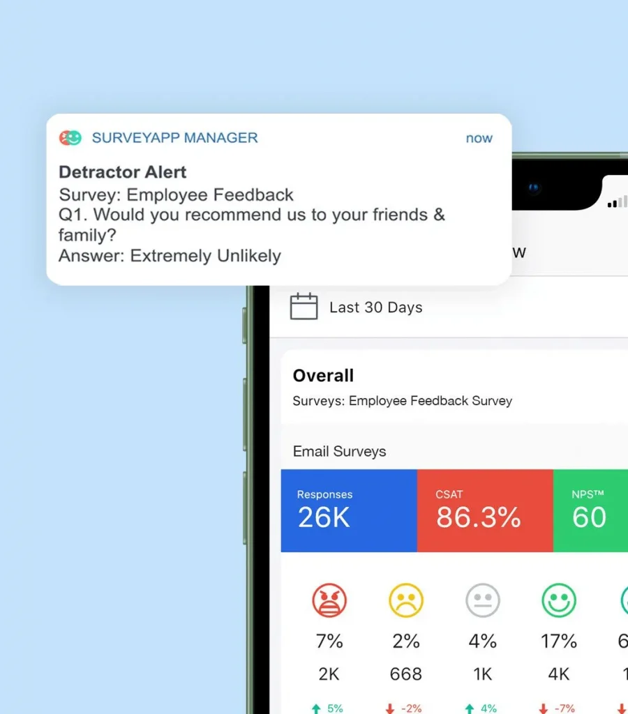 With easy-to-read visualizations of real-time data, Surveyapp’s reporting platform is designed for customizable, role-based data views and powerful analysis. Spot patterns and trends in your data, compare scores, and read comments as they come in. See your data snap to life visually and track your performance over time.