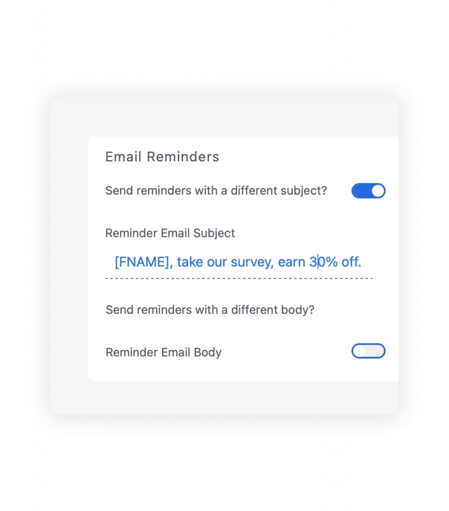 Gently nudge your respondents to complete their surveys if they haven’t done so, with our reminder emails feature. Customise the reminder emails with a different subject and content and even use incentives to encourage completion and achieve a higher response rate.