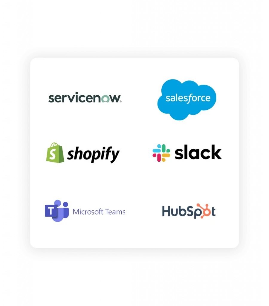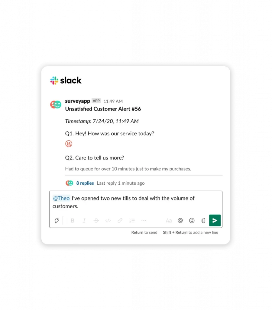 Our integrations make it quick and easy to get the most out of Surveyapp. Ensure the right teams take action on time-sensitive feedback in the tools they use every day. Send critical feedback through Slack, escalate technical issues in ServiceNow, and trigger customer follow-up in Salesforce, and more.