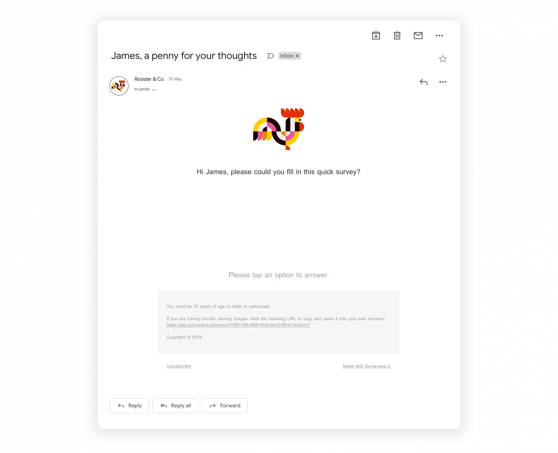 Customers and employees respond to questions embedded directly in the email, right from their inbox and then continue the conversation in the browser. Fewer clicks and taps mean exceptionally high response rates for you and a better experience for your respondents.Engaged users deliver the best-quality feedback. Surveyapp does this by being familiar, intuitive and visual – asking questions in a human, conversational style to encourage interaction and deliver a high response rate.