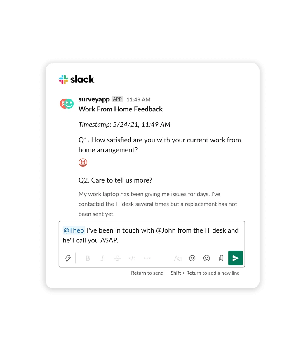 Optimise your workflows using Surveyapp’s easy integration with other HR tools, including Service Now, Salesforce, Slack, Microsoft Teams, and Hubspot.