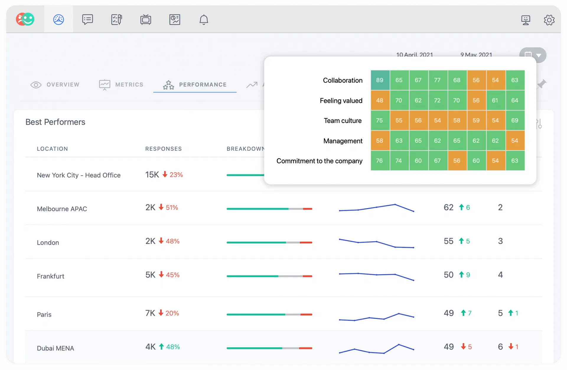 Surveyapp’s listening engine lets you track employee happiness, and quickly tackle any issues that are damaging motivation.